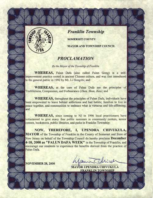 【明慧網2000年12月15日】新澤西州弗蘭克林市市長宣布2000年12月4-10日為法輪大法週