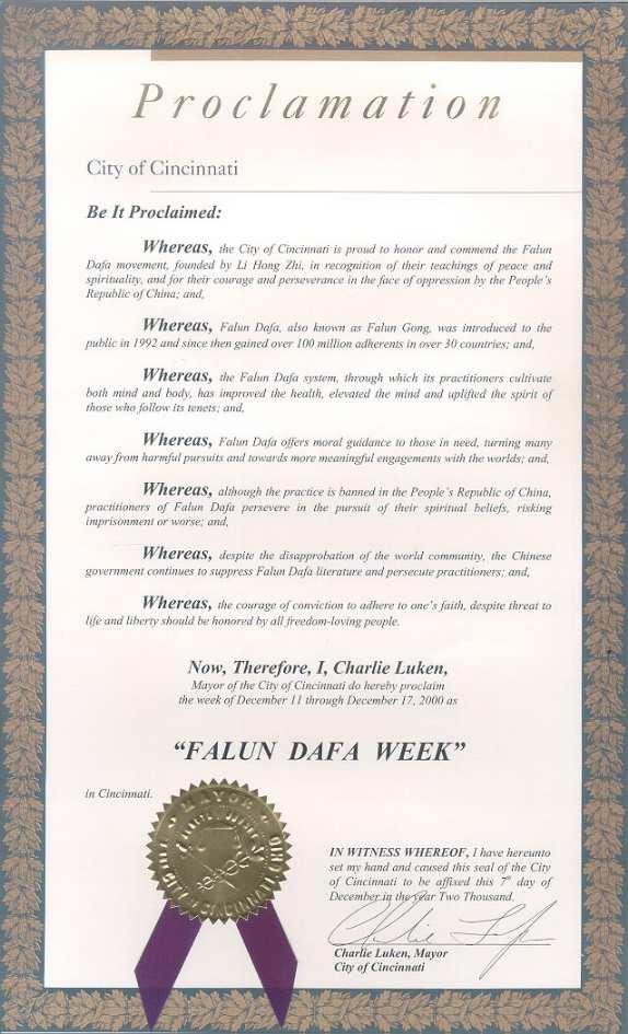 【明慧網2000年12月15日】俄亥俄州辛辛那提市市長宣布2000年12月11-17日為法輪大法週