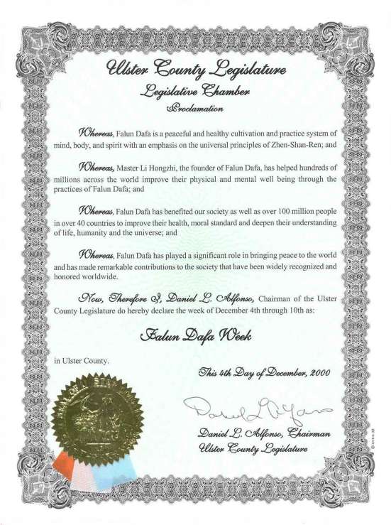 【明慧網2000年12月15日】 紐約州優斯特市宣布2000年12月4日至10日為法輪大法週
