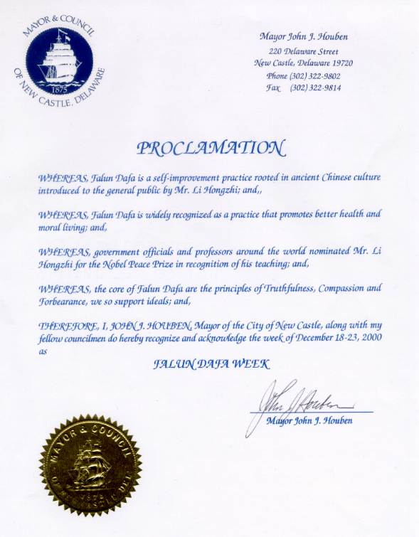 【明慧網2000年12月17日】 紐卡斯爾市(City of New Castle):市長約翰.J.赫本(John J. Houben) 褒獎法輪大法,定2000年12月18日至23日為特拉華州紐卡斯爾市法輪大法週。