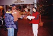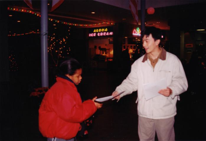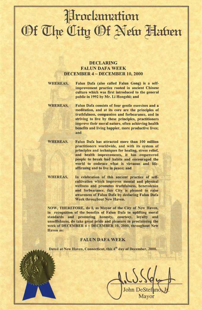 【明慧網2000年12月20日】 康卅紐黑文市與桔子鎮宣布十二月四日至十日為「法輪大法週」。十二月四日紐黑文市市長親自主持了在市政府舉行的法輪大法週頒獎典禮,學員做了功法表演,當地電視台和廣播電台的記者到場作了採訪與報導。當地報紙採訪了我們在市圖書館舉辦的大法介紹會並作了正面報導。當地有線電視反覆播放了法輪功真實故事上下集。學員們充份利用這些條件在當地舉辦多次介紹會。市購物中心的經理對我們熱情支持讓我們在聖誕節購物旺季在購物中心設展板、表演功法、與散發傳單。