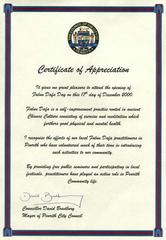 * 我很高興參加2000年12月17號法輪大法日的開幕儀式。* 法輪大法是一種使人的身心都得到更加健康的自我提高功法,這一功法根植於古老的中國文化包括動作和打坐。* 潘瑞斯市的法輪大法修煉者們將他們的大量時間義務地為本社區介紹法輪大法,對他們所作的努力,我非常賞識。* 通過參加各種當地文化節活動和提供免費的教功活動,潘瑞斯的大法修煉者們在潘瑞斯的社區生活中發揮了積極的作用。