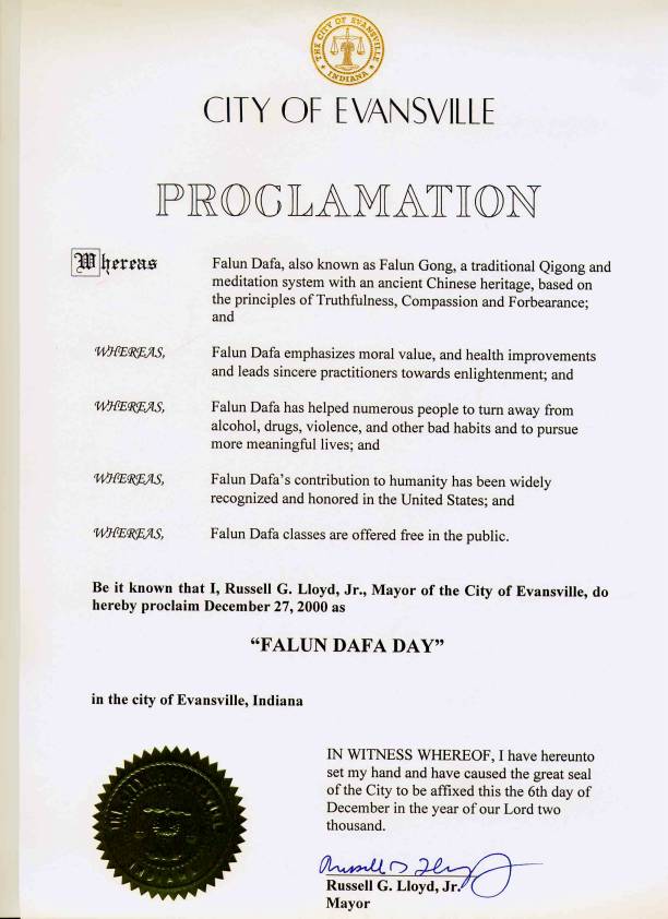 【明慧網2000年12月24日】 印第安娜州艾文斯維爾宣布2000年12月27日為「法輪大法日」