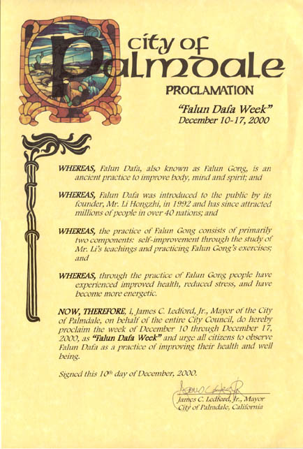 宣布2000年12月10日至17日為法輪大法週,並敦促全體市民關注法輪大法這一改善