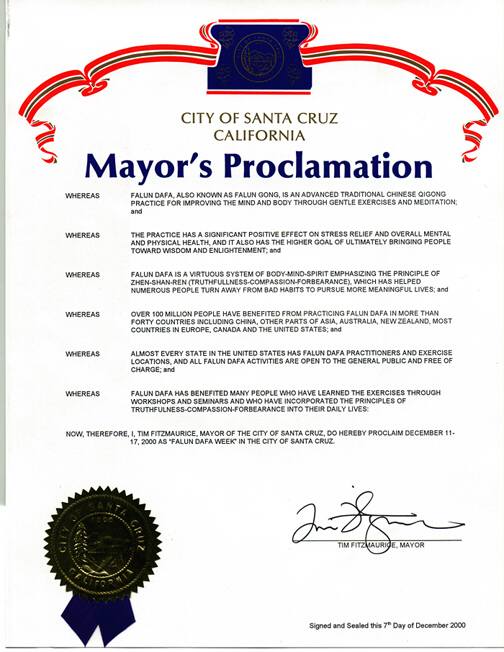 所以,現在,我,聖塔克魯茲市市長在此宣告,2000年12月11日至17日為聖塔克魯茲市的法輪大法週。