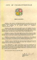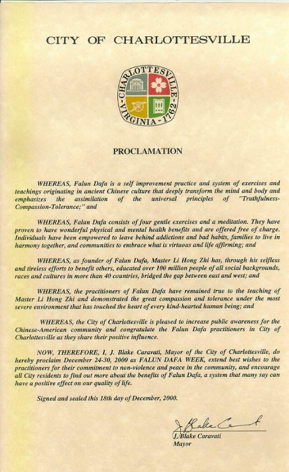 【明慧網2000年12月26日】 弗吉尼亞州夏洛特維爾市宣布2000年12月24日至30日為「法輪大法週」