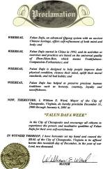 【明慧網2000年12月31日】 弗吉尼亞州奇薩皮科市宣布2000年12月31日至2001年1月6日為「法輪大法週」