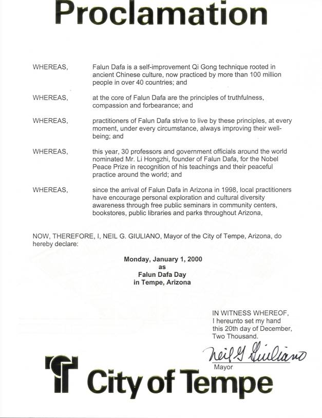 鑑於,法輪大法於1998首次傳入亞利桑那州,自那以後,當地的學員們義務在亞利桑那州的社區中心,書店,公共圖書館和公園舉辦了許多次免費公開講座。