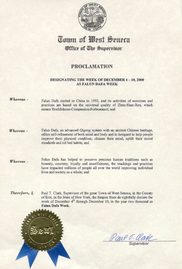 因此,我,保羅﹒T﹒克拉克,紐約州愛裏郡西塞尼克鎮主管,莊嚴宣布2000年12月4-10日為法輪大法週。