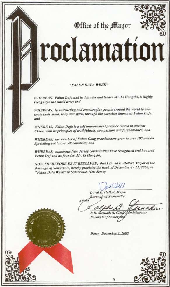 我David E. Hollod, 以Somerville鎮鎮長身份宣布,2000年12月4-11日為Somerville鎮法輪大法週。