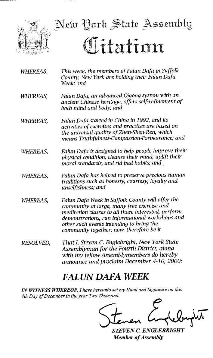紐約州第4選區眾議員宣布「法輪大法週」