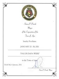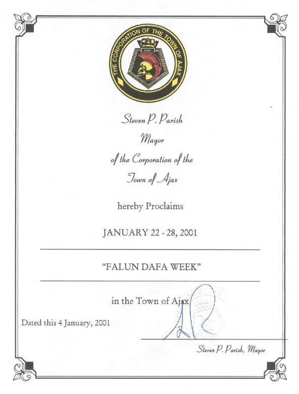 【明慧網2001年1月17日】 加拿大安大略省的愛加克思鎮宣布2001年1月22-28日為「法輪大法週」