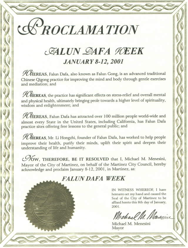 【明慧網2001年1月18日】 加州馬丁納茲市宣布2001年1月8-12日為「法輪大法週」