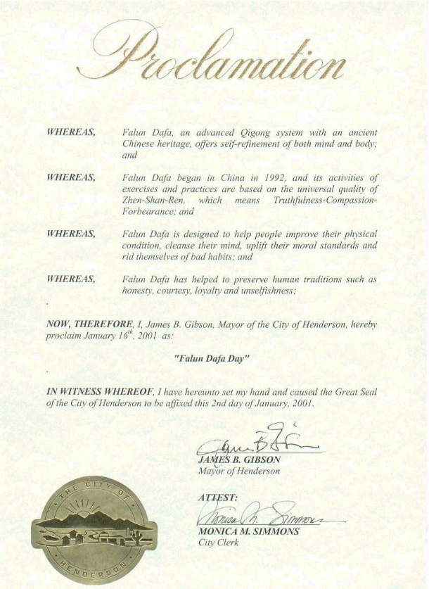 【明慧網2001年1月18日】 內華達州漢得森市市長James B. Gibson宣布2001年1月2日為法輪大法日
