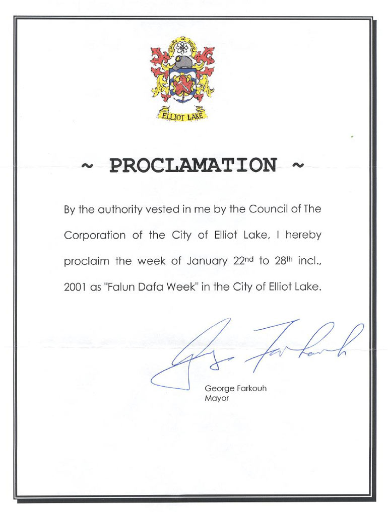 【明慧網2001年1月19日】 加拿大安大略省意裏額特湖市市長George Farkouh宣布2001年1月22-28日為"法輪大法週"