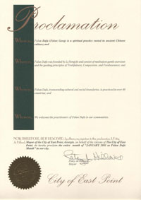 【明慧網2001年1月19日】 喬治亞州東坡爾特市市長宣布2001年1月為「法輪大法月」