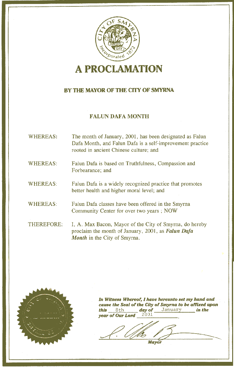 【明慧網2001年1月19日】喬治亞州斯馬瑞納市市長宣布2001年1月為「法輪大法月」