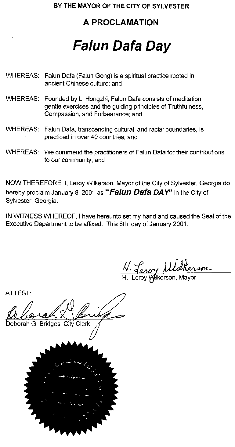 【明慧網2001年1月19日】 喬治亞州西爾維斯特市市長宣布2001年1月8日為「法輪大法日」