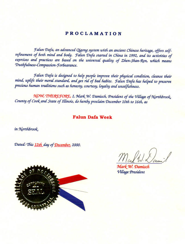 【明慧網2001年1月20日】 伊利諾伊州北布魯克市(NORTHBROOK)宣布二零零零年十二月十日至十六日為該市的「法輪大法週」。