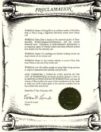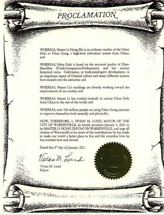 【明慧網2001年1月20日】 伊利諾伊州沃倫維爾(Warrenville)市命名二零零一年一月五日為「李洪志大師日」。並希望所有沃倫維爾市居民關注李洪志大師對世界和無數眾生的社會做出的貢獻。