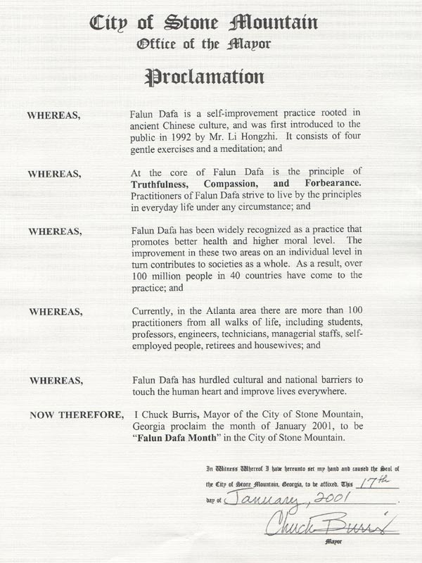 【明慧網2001年1月23日】 喬治亞州石頭山市宣布2001年1月為「法輪大法月」