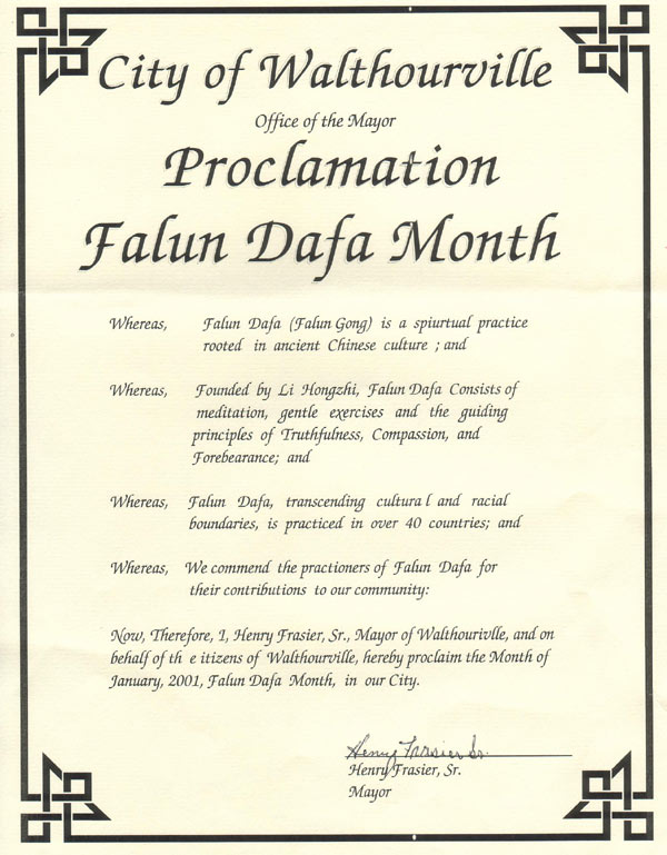 【明慧網2001年1月23日】 喬治亞州沃斯維爾市宣布2001年1月為「法輪大法月」。