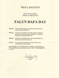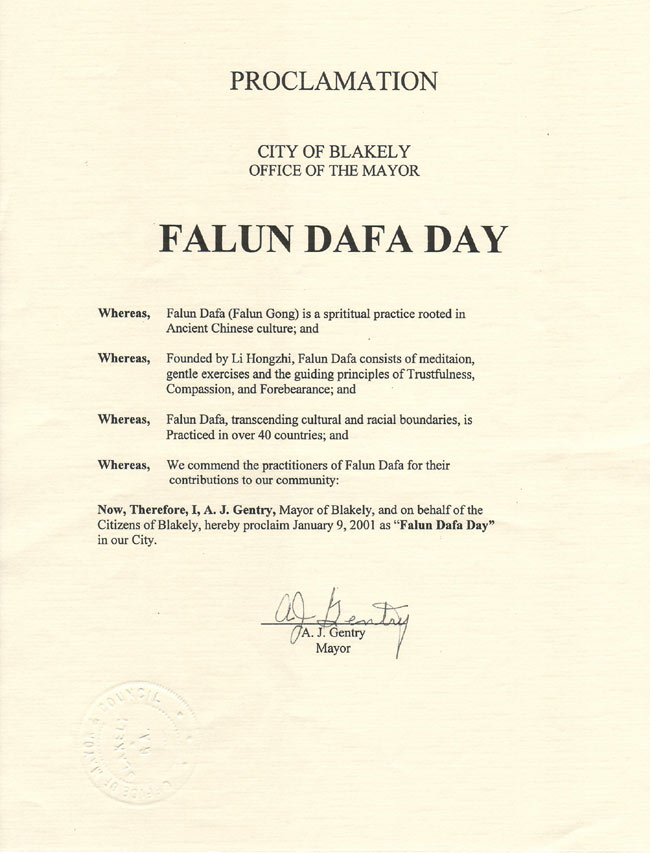 【明慧網2001年1月23日】 喬治亞州布雷克里市宣布2001年1月9日為「法輪大法日」。