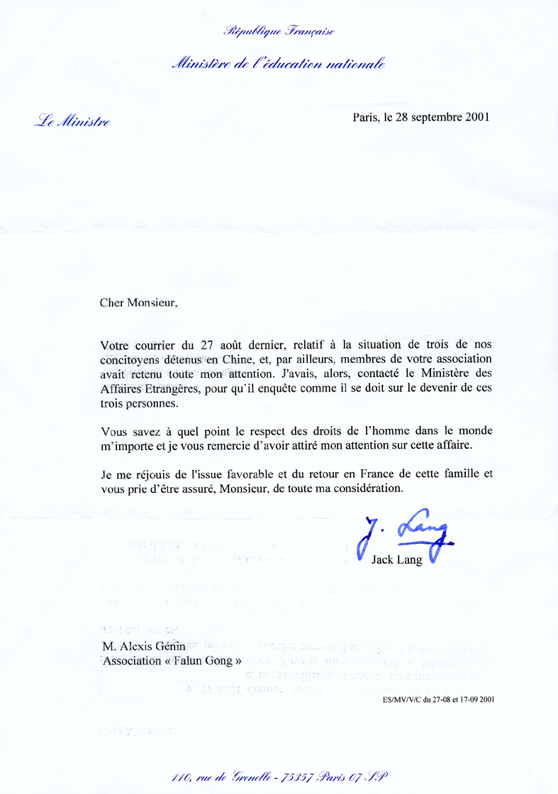 最近,熱心參與營救並在其中起了重要作用的法國教育部長近日致函法國法輪功學員,繼續表示對人權問題的高度重視,於赤堅一家最終獲救返回法國一事,喜悅之情溢於言表。來函全文如下: