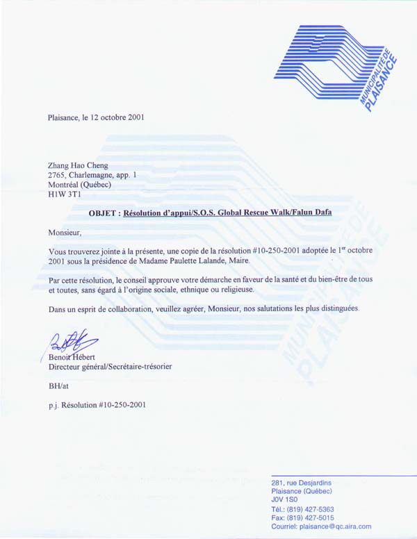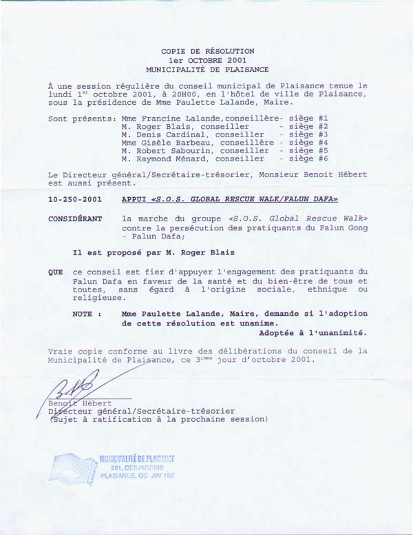 十月一日20點在加拿大葡勒珊斯(Plaisance)市市政廳由市長葩麗﹒拉蘭德(Paulette Lalande)女士,由6名市議員,法蘭馨﹒拉蘭德(Francine Lalande), 若捷﹒布萊斯(Roger Blais), 德立斯﹒卡地納(Denis Cardinal), Gisèle Barbeau, 羅伯特﹒塞伯因(Robert Sabourin), 瑞芒德﹒梅納得(Raymond Ménard) 和市主管白諾依特﹒荷伯特(Benoit Hébert)出席,由市議員若捷﹒布萊斯(Roger Blais)提出的支持法輪大法「SOS全球緊急救援步行」 的10-250-2001議題被一致通過。