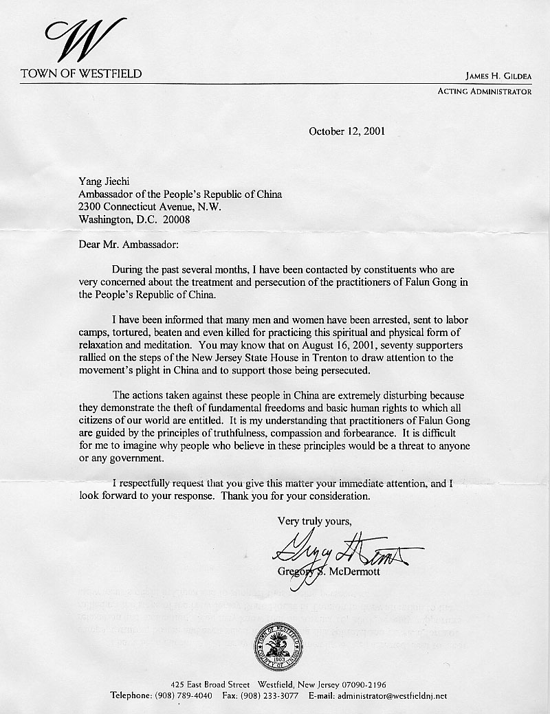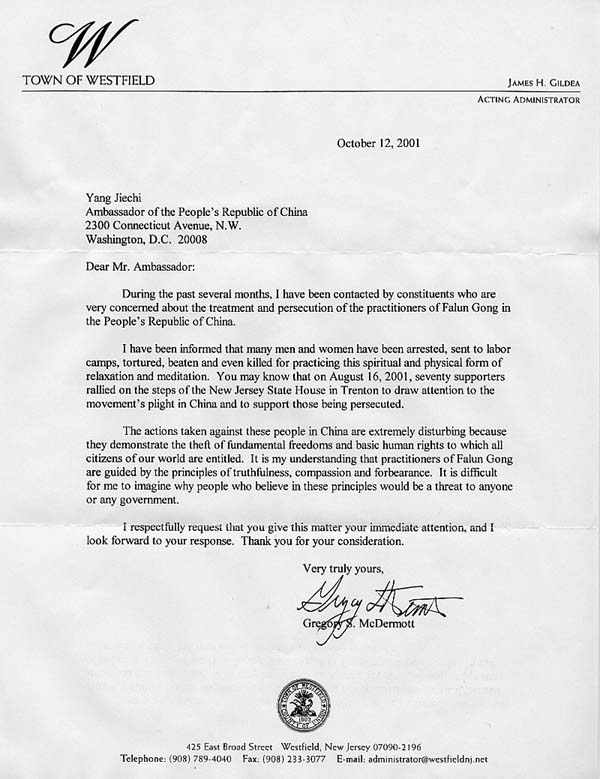 我被告知許多人由於修煉了這一打坐和放鬆精神和身體的煉功方法而被逮捕,關進勞改營,折磨,毆打,甚至被殺害。也許你已知道,2001年8月16日,七十多名支持者在川頓市的新澤西州州政府大樓前集會,以引起人們對這一運動在中國所處困境的注意和支持那些受迫害的人們。