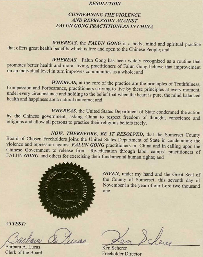 【明慧網2001年11月13日】新澤西州薩麼賽特郡政府近日通過一項決議,加入譴責中國(江澤民)政府迫害法輪功學員的行列。在決議案中郡政府肯定了法輪功的功效和它的指導思想,呼籲中國(江澤民)政府立即釋放勞教所裏被強制洗腦的法輪功學員,並尊重他們的人權。