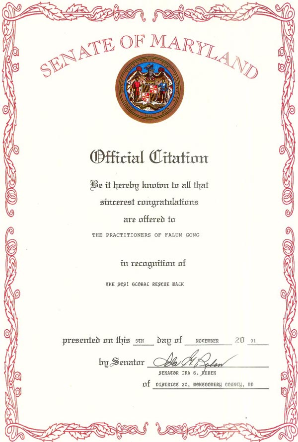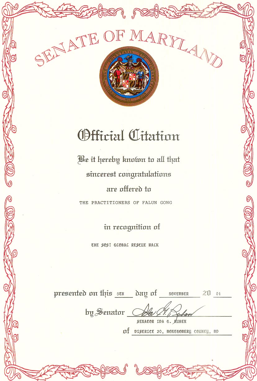 馬裏蘭州蒙哥馬裏郡第20區參議員IDA G. Ruben2001年11月5日