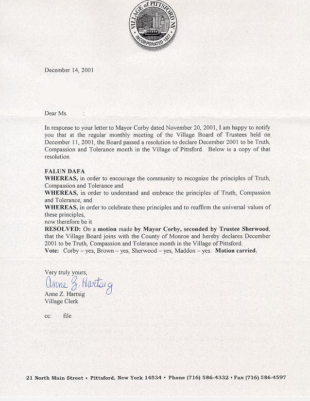 特此決定,經鎮長科比和理事薛伍德提議,鎮董事會與蒙羅郡一起,宣布2001年12月為匹茨福德鎮「真、善、忍月」