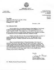幾位居民就法輪功修煉者在中國的待遇問題與中塞克斯郡(MIDDLESEX)郡委會(Board of Chosen Freeholders)的成員聯繫。尤其是當這些居民從報導中獲悉法輪功修煉者遭到逮捕,人身虐待,甚至被迫害致死時,他們感到了極大的憂慮。據稱這些(暴行)均為中華人民共和國政府的官員所為。