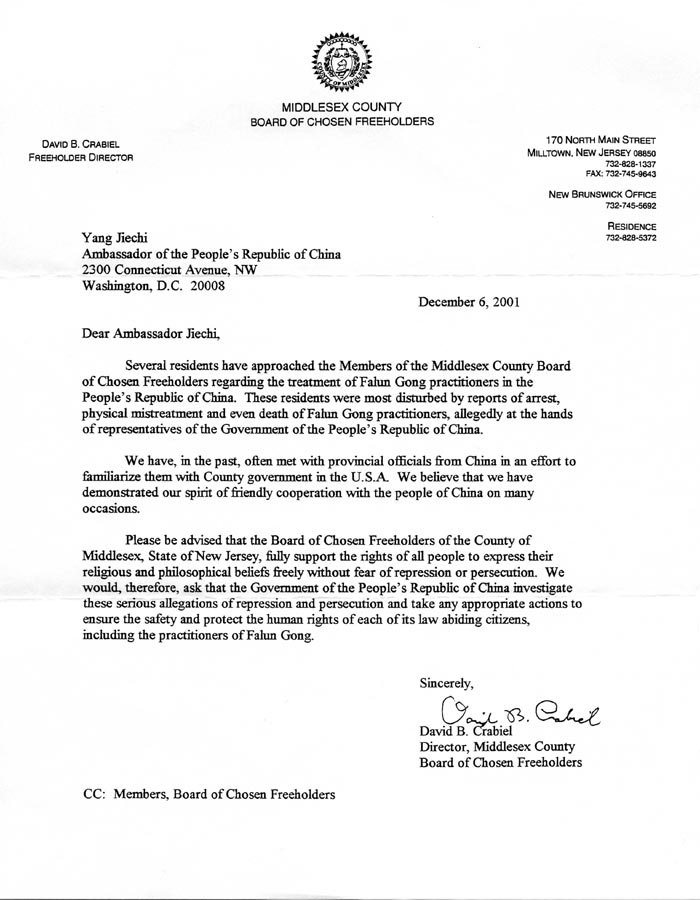 請注意,新澤西州中塞克斯郡郡委會完全支持人類自由表達宗教信仰的權利,而絕不應存在鎮壓和迫害的威脅。因此我們要求中國政府調查這些鎮壓和迫害的嚴肅指控,並相應採取一切適當的行動保證每個守法公民(包括法輪功修煉者)的安全並維護他們的人權。
