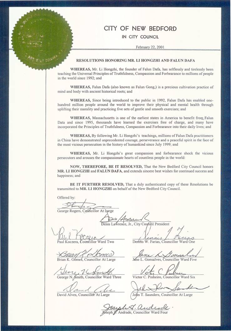 在此新百得福(NEW BEDFORD)褒獎李洪志先生和法輪大法,並真誠的祝願你們幸運和繼續取得成功。