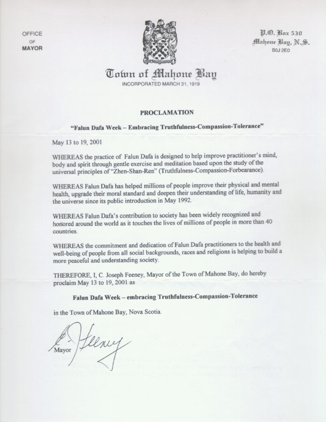 【明慧網2001年5月13日】加拿大諾瓦斯堪地亞省瑪鴻灣鎮宣布2001年5月13日至19日為「法輪大法真善忍週」