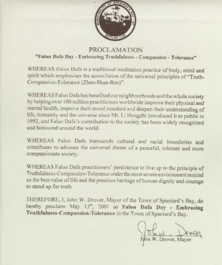 【明慧網2001年5月17日】加拿大紐芬蘭省斯伯尼亞德灣鎮宣布2001年5月13日為「法輪大法真善忍日」。