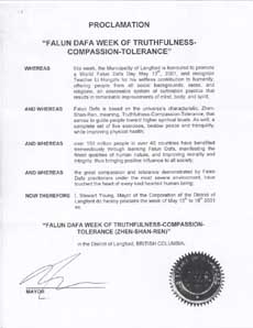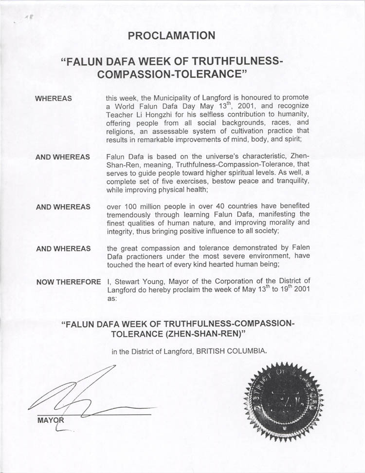 【明慧網2001年6月4日】加拿大不列顛哥倫比亞省蘭福德鎮宣布2001年5月13日至19日為「法輪大法真善忍週」。