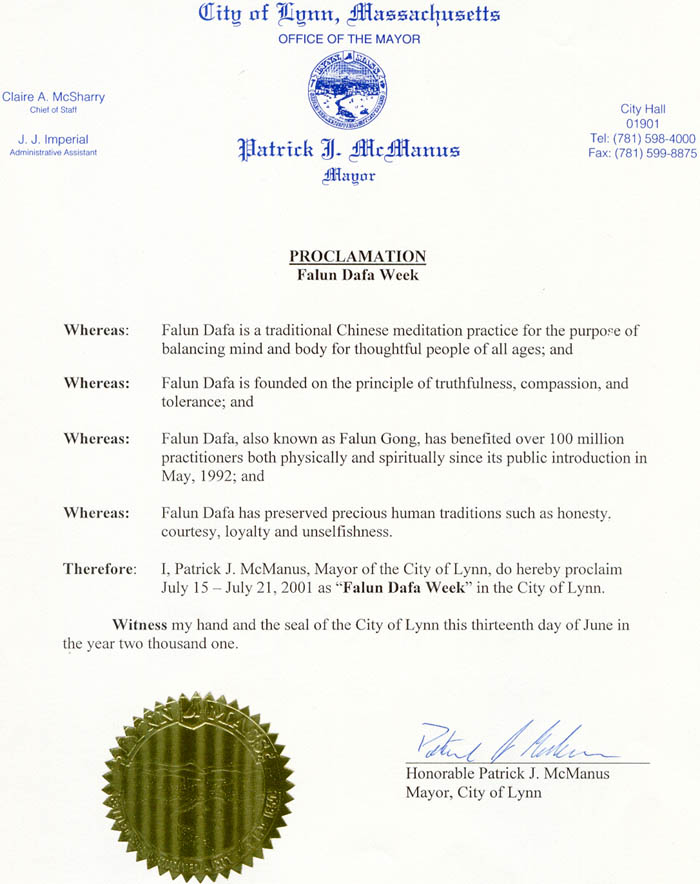 馬薩諸塞州婁維爾市褒獎法輪大法