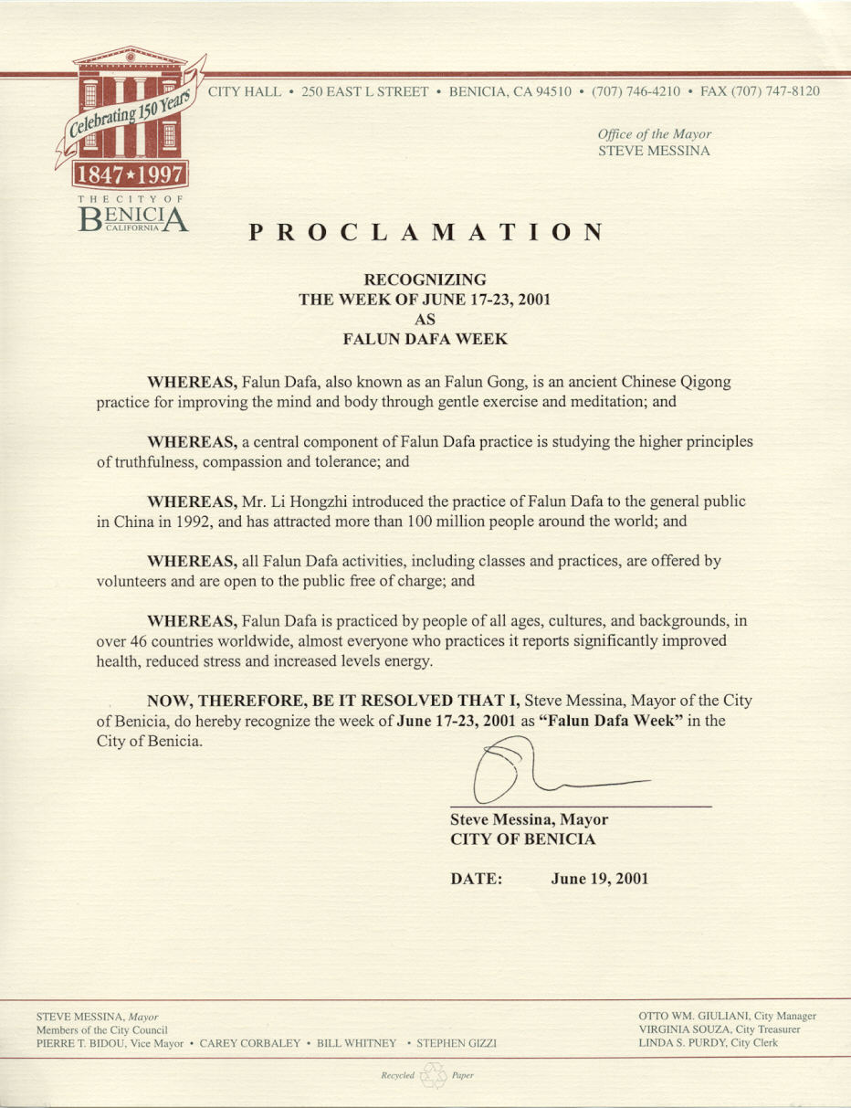 【明慧網2001年7月13日】加州貝尼莎市(Benicia, California)宣布2001年6月17日至23日為「法輪大法週」。