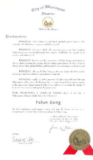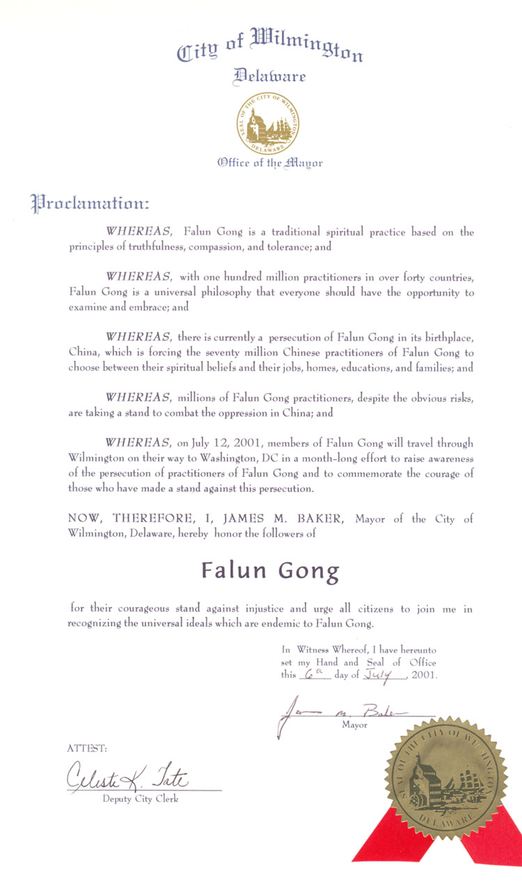 【明慧網2001年7月17日】特拉華州威明頓市市長嘉獎法輪功修煉者伸張正義的勇氣和堅定。