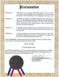 【明慧網2001年7月28日】路易斯安那州州府巴吞魯日市宣布2001年7月14日為「法輪大法日」。
