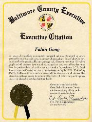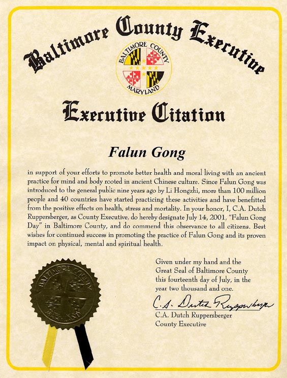 我,C. A. Dutch Ruppersberger,作為縣行政長官,向你們表示敬意,並向所有市民推薦這一功法。對你們繼續洪揚法輪功以及他在生理、心理和精神上所起到的作用表示最美好的祝願。