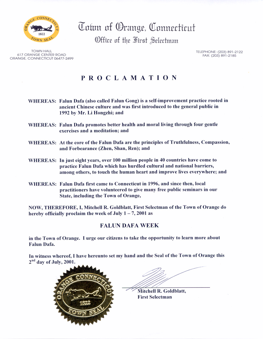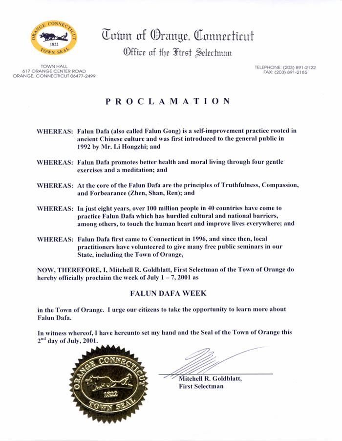 【明慧網2001年7月8日】康涅狄格州桔子鎮宣布2001年7月1日至7日為「法輪大法週」。