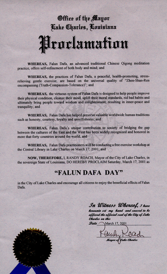 【明慧網2001年8月17日】路易斯安那州查爾斯湖市宣布2001年3月17日為「法輪大法日」。