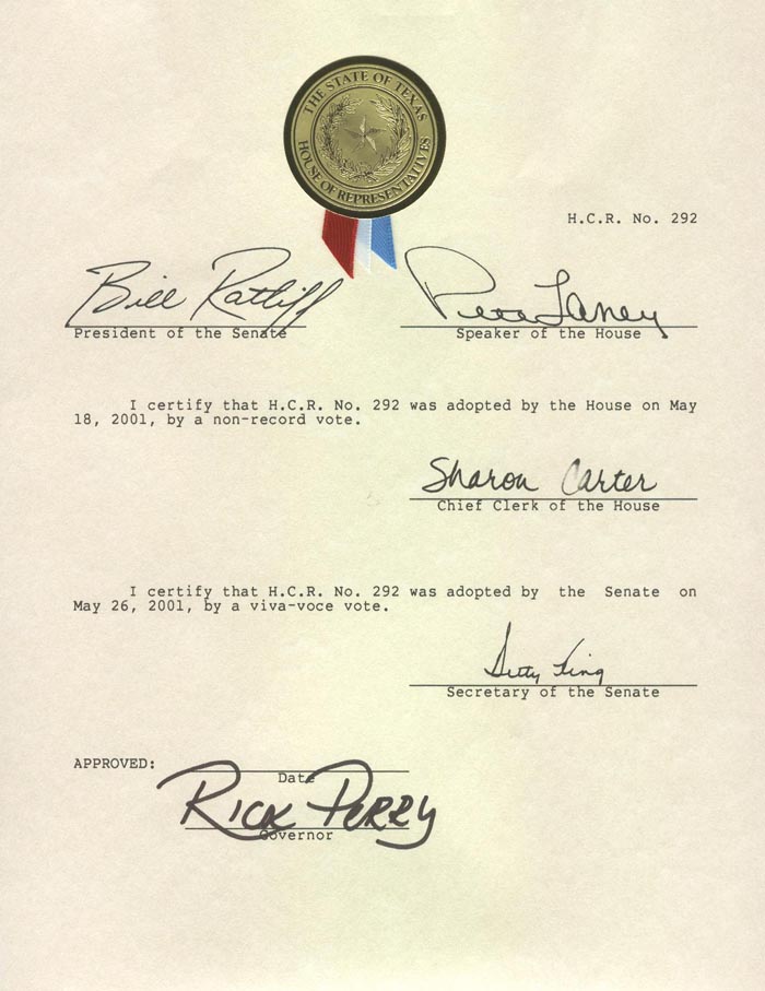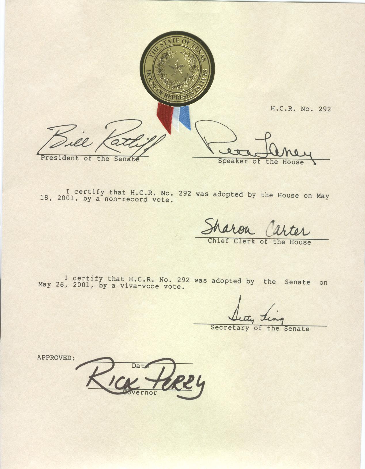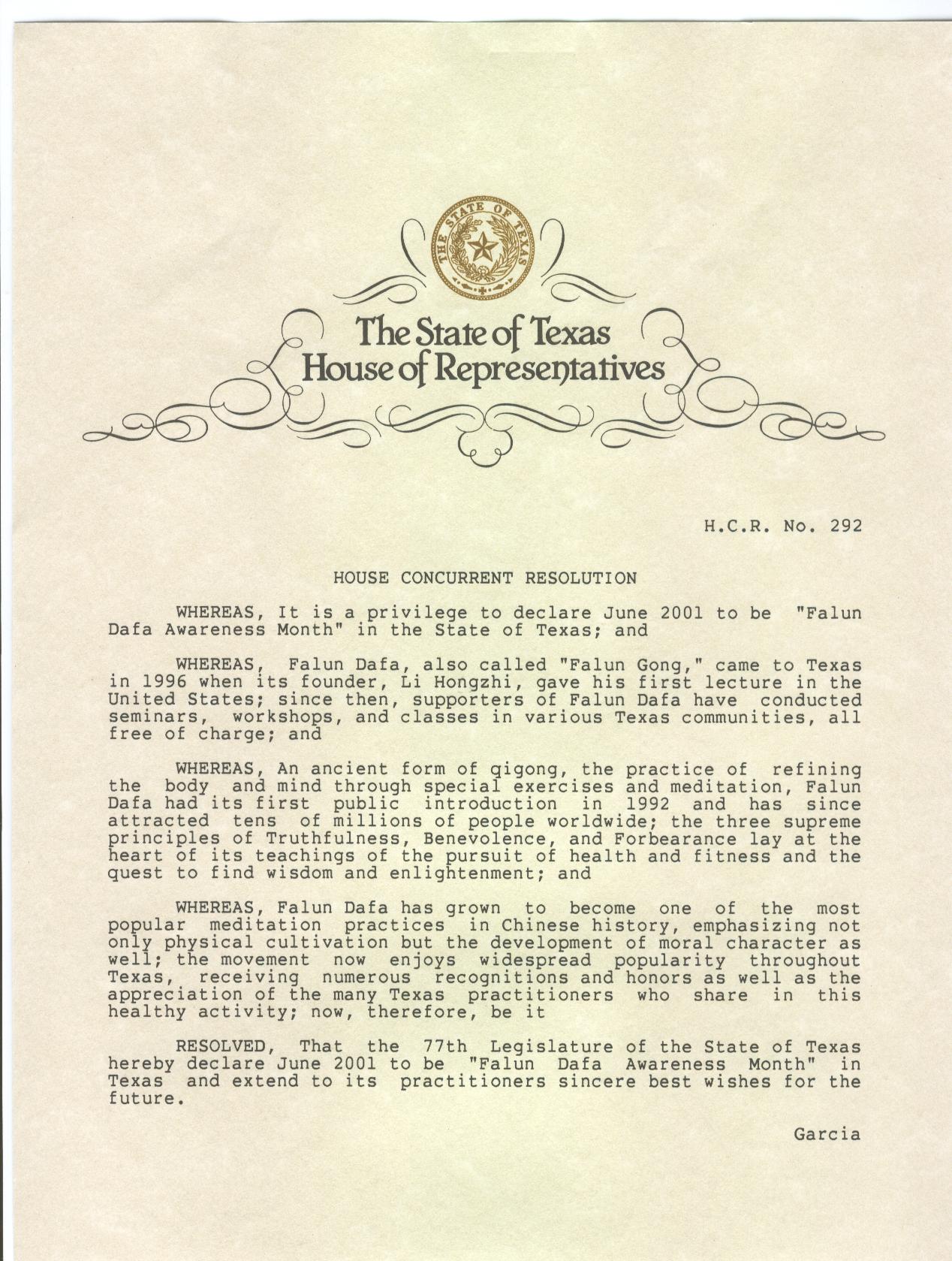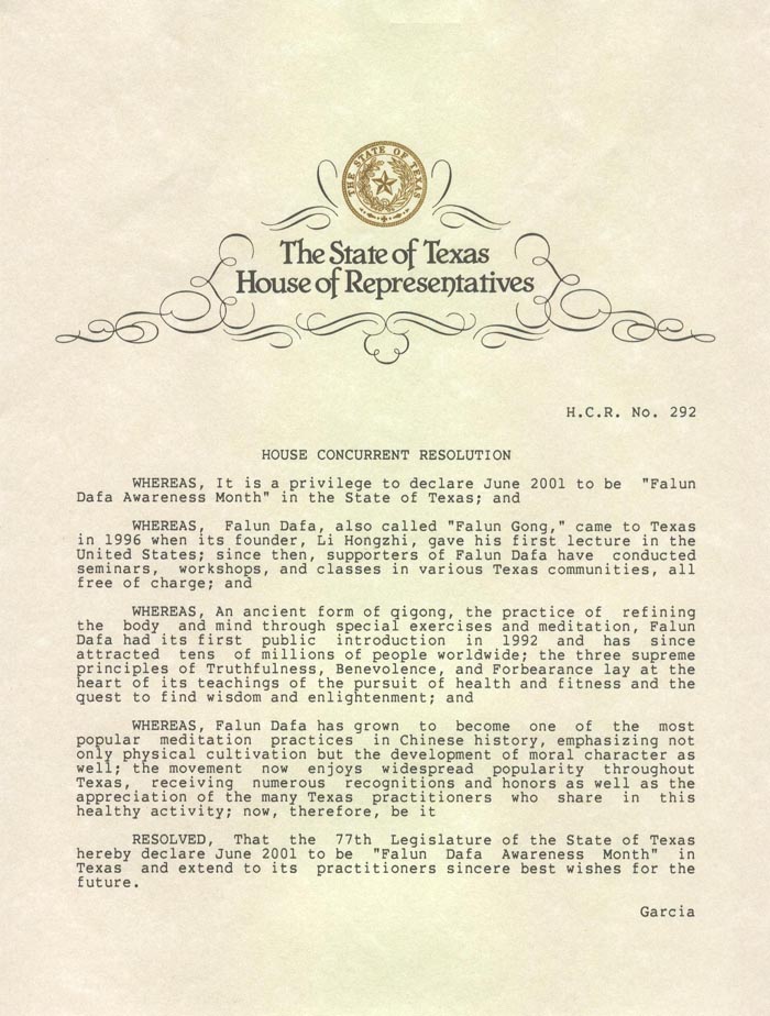 決議如下,得克薩斯州第77屆州議會宣布2001年6月為得克薩斯州「法輪大法認知月」並向修煉者的未來致以最美好的祝願。