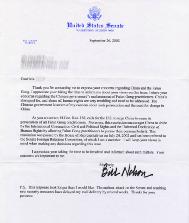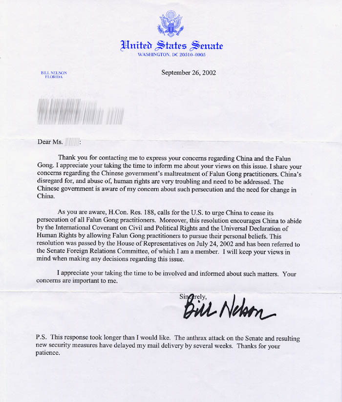 誠如您所知,美國眾議院188號決議要求美國政府敦促中國停止對所有法輪功修煉者的迫害。而且,此決議案鼓勵中國遵守國際民權和政治權利公約以及全球人權宣言,允許法輪功修煉者追尋他們的個人信仰。此決議案於2002年7月24日獲眾議院通過,並提交到參議院外交事務委員會審議。我是此委員會成員之一。在此議項作決定時,我會考慮您的意見。