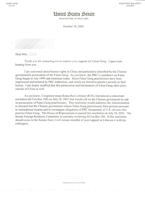 正如您所知道的,聯邦眾議員伊蓮娜.羅斯雷婷恩(Ileana Ros-Lehtinen)在2001年7月18日發起了188決議,敦促中國[江氏]政府停止對法輪功學員的迫害。這一提案授權美國政府要求中國政府按國際慣例釋放被關押的法輪功學員,調查中國[江氏]政府對修煉法輪功的美國公民的騷擾。這一提案於2002年7月24日在眾議院通過。一旦這一提案提交參議院,我在與我的同僚們討論此議案時將記住您對法輪功的支持。