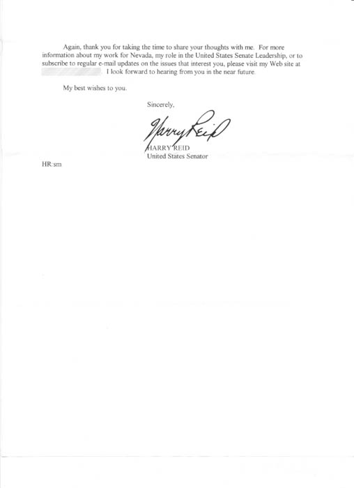 再次感謝您撥冗與我交流您的看法。如您想知道更多關於我對內華達州的工作、我在參議院所起的領導作用,或經常通過電子郵件了解您感興趣事宜,請瀏覽我的網址(略)。期待著在不久的將來再次聽到您的音信。
